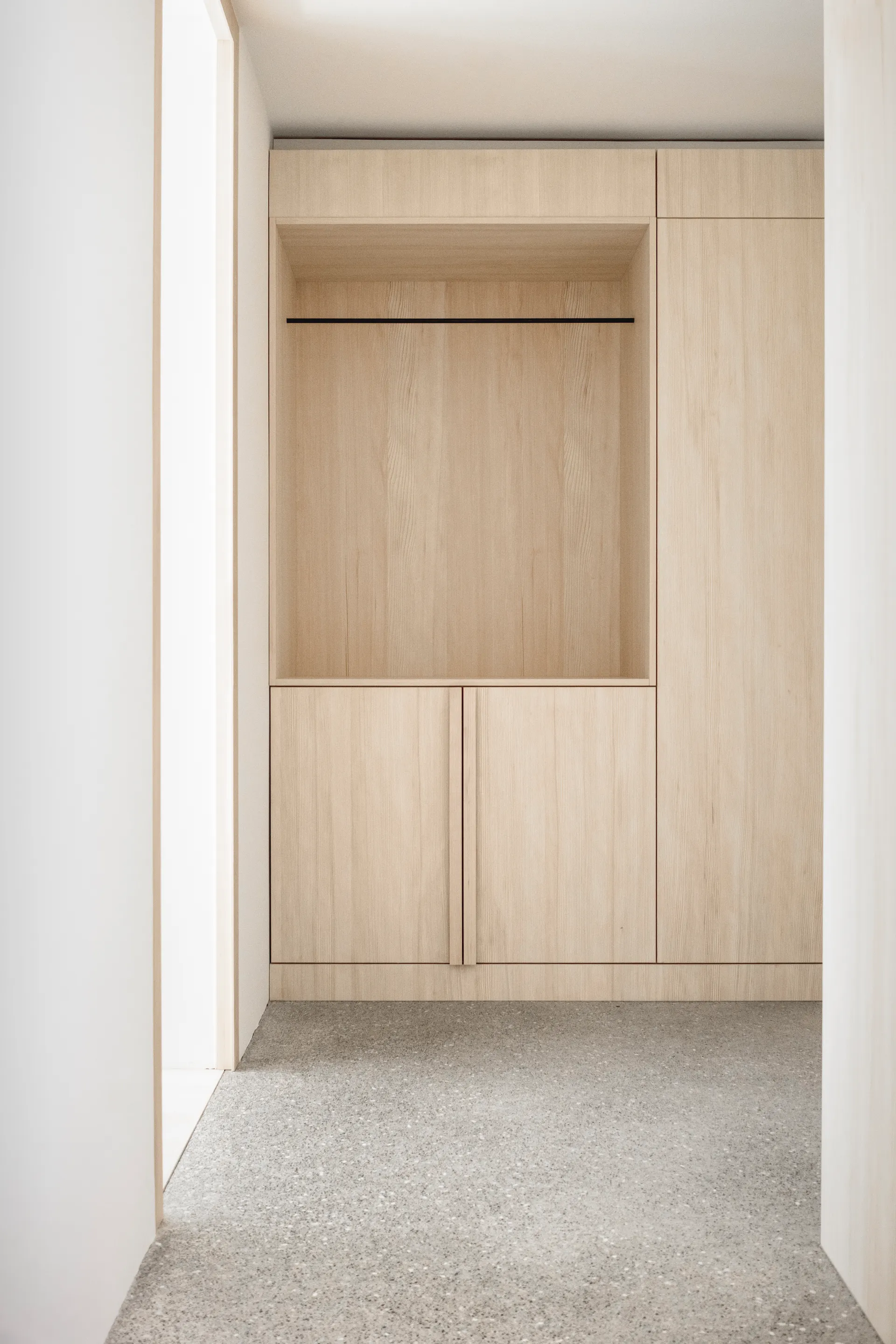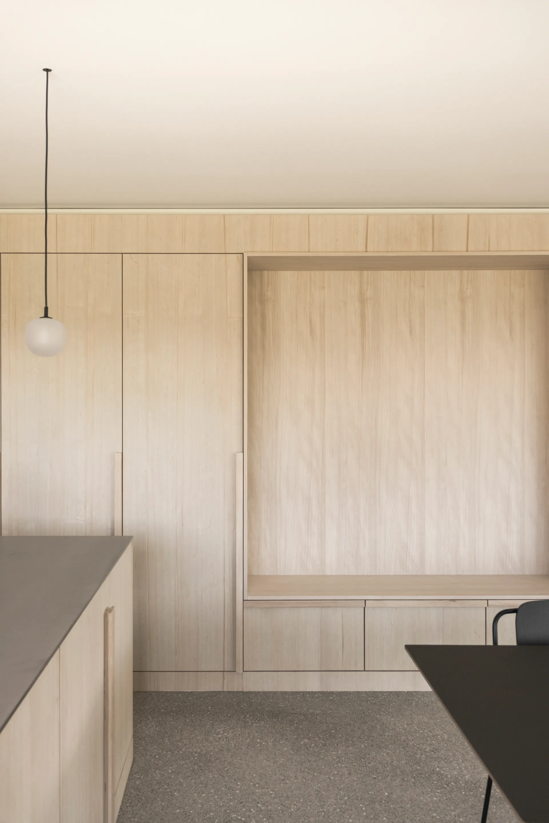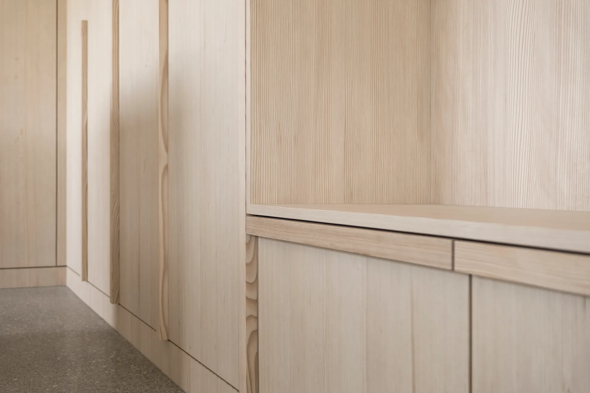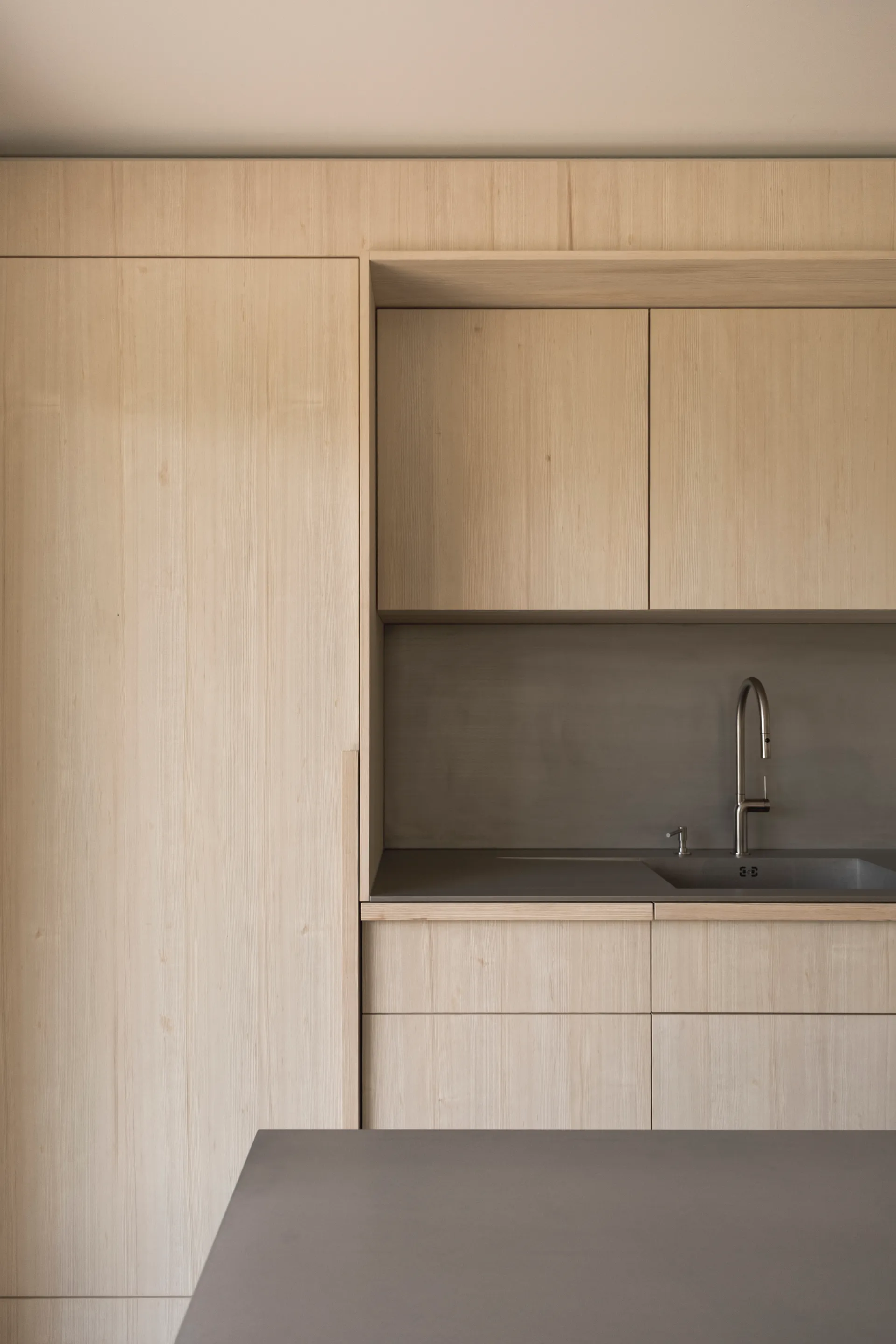 Die Detaillierung — in Form von Nischen und aufgesetzten Griffleisten schaffen eine sorgfältige Tiefe und strukturiert Möbel und Raum gleichermaßen. Edelstahloberflächen formen einen wohltuenden Kontrast.