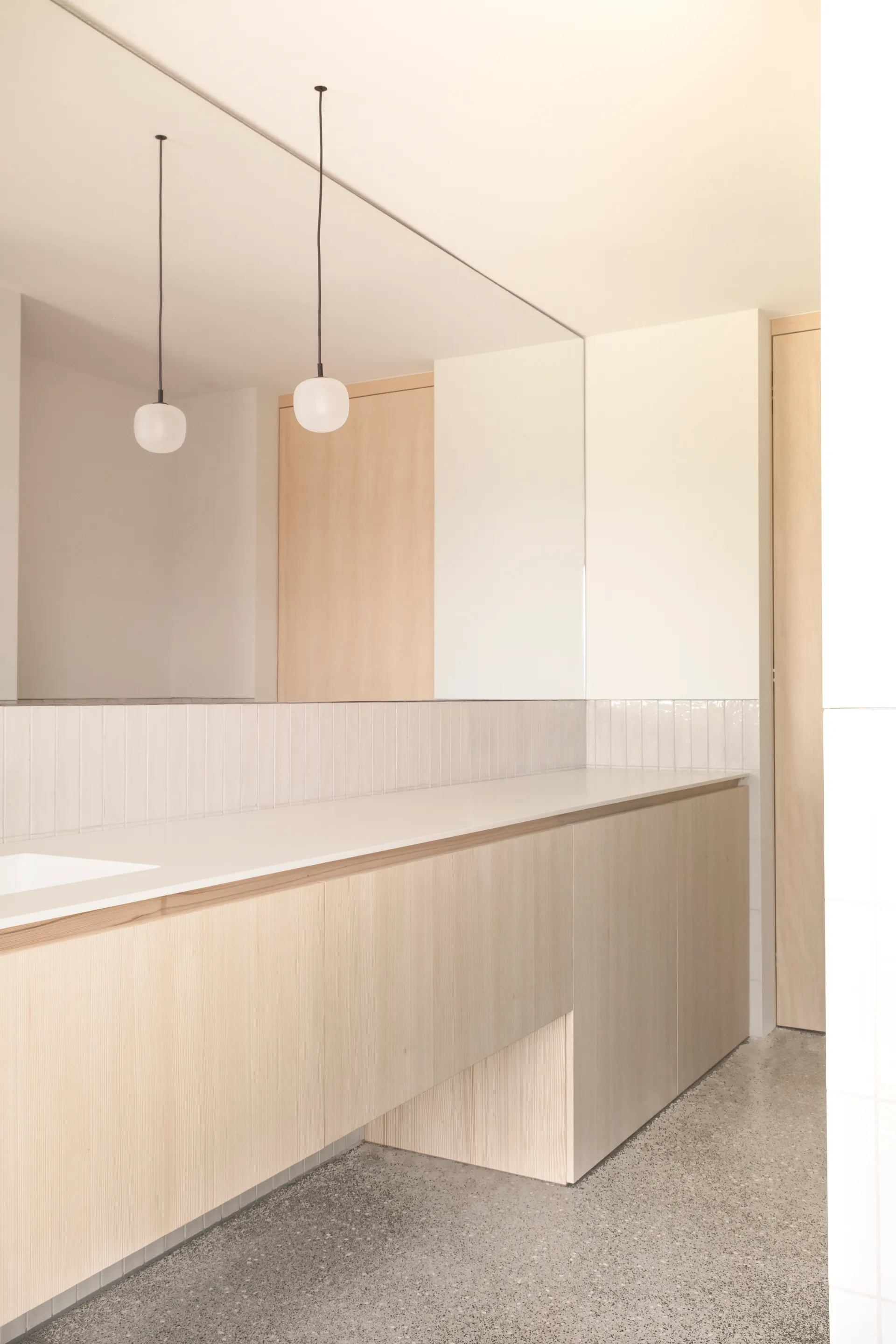 Die Materialisierung — mit hochwertigen und schlichten Materialien: Holz, Stein, Stahl, Glas. Das Badezimmer mit handgeformten Fliesen, einem langen Waschtisch aus Weisstanne mit einer Abdeckung aus Corian. Die Möbel aus Weisstanne, weiss geölt, mit aufgesetzten Griffleisten und eingelassen Sitznischen, der Ofen aus mattweisen Kacheln mit Details aus Schwarzstahl und die Beleuchtung mit großen, matten Glaskugeln.