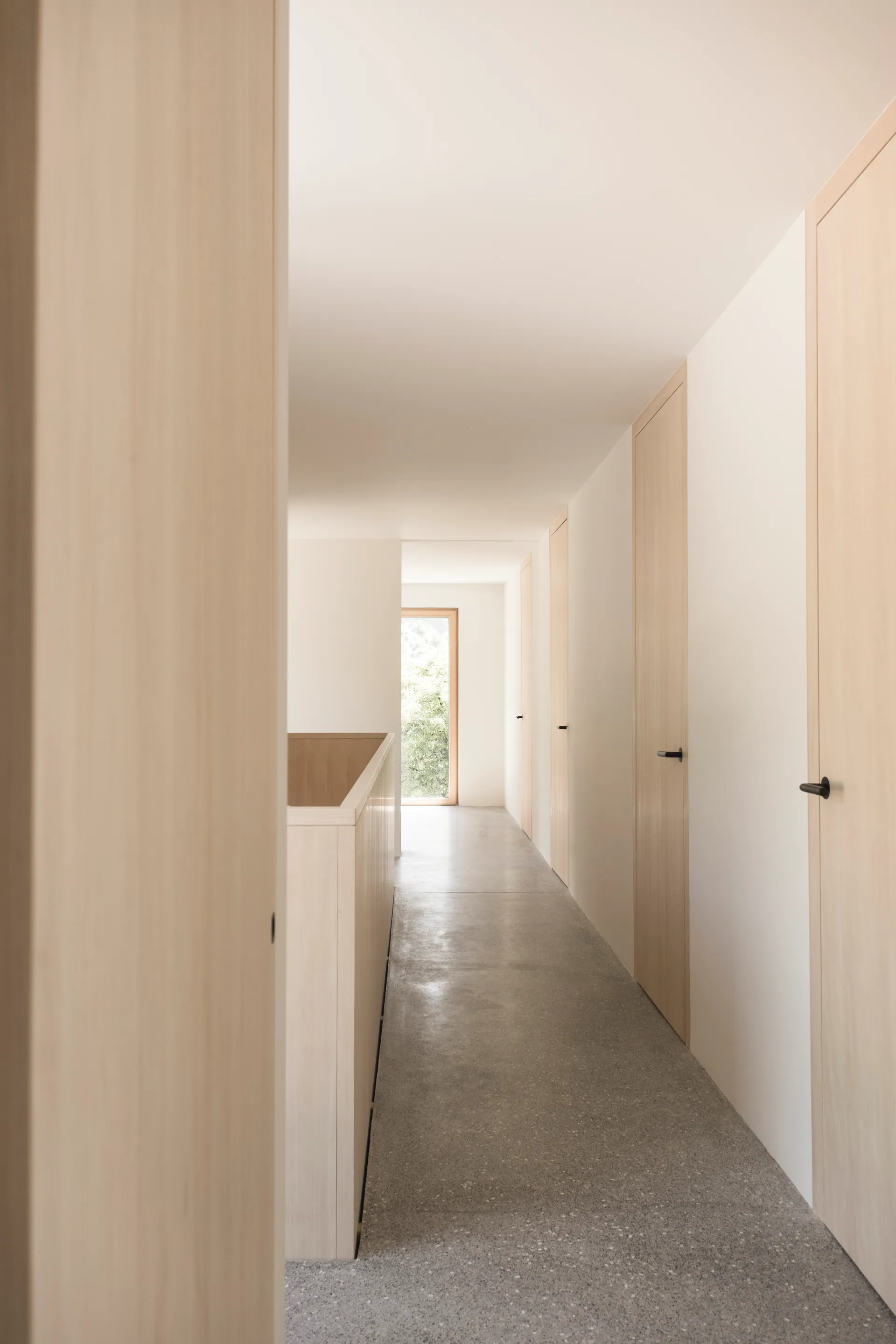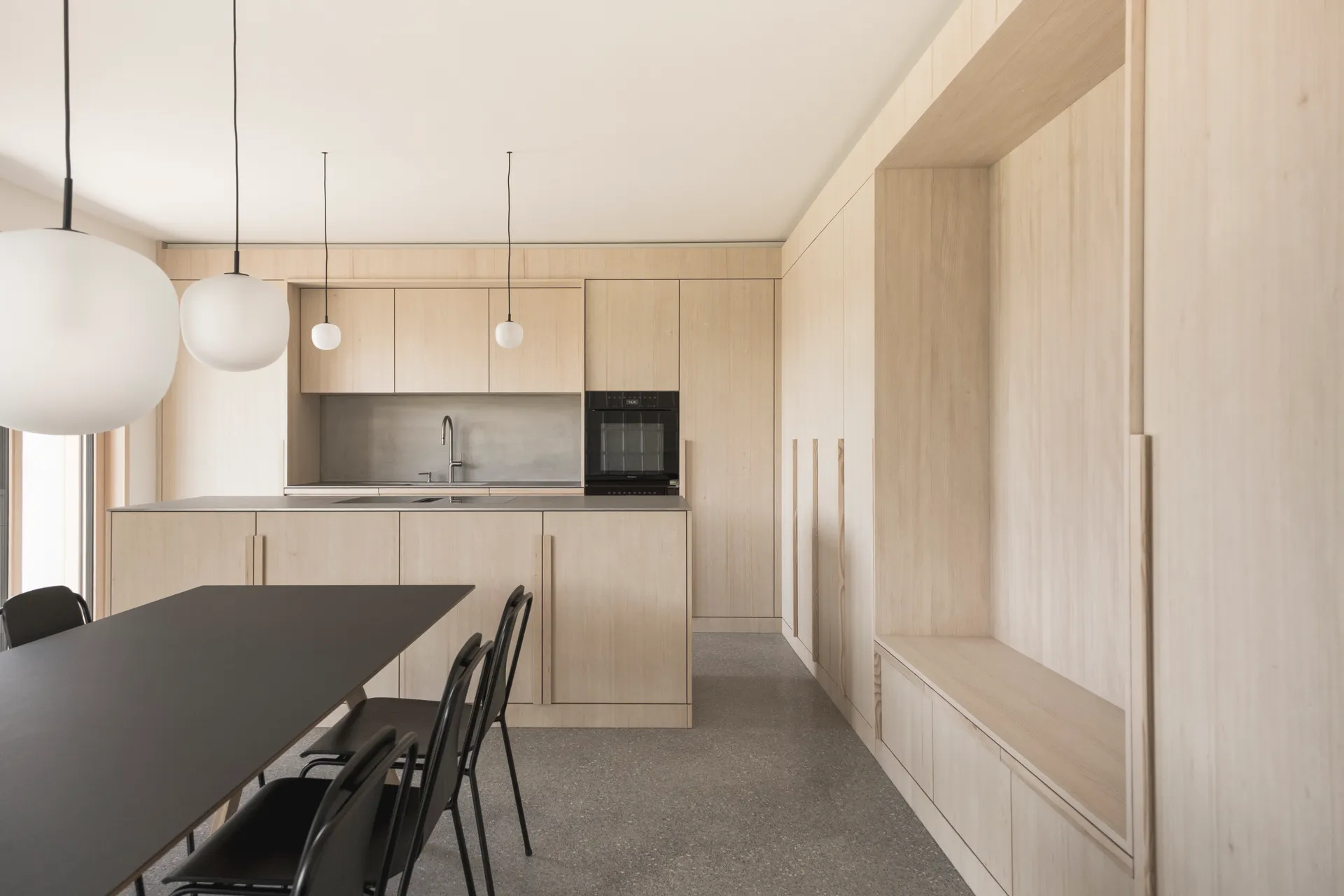 Der Boden — unterstreicht die Raumabfolge des Grundrisses. Die Küche, die Badezimmer und die Nebenräume haben einen dunklen, geschliffenen Unterlagsboden; während der Boden in Schlafzimmer, Wohnzimmer und der Treppenaufgang in Weißtanne, massiv und geseift ausgeführt sind. Die Räume erhalten dadurch unterschiedliche Atmosphären und Aufenthaltsqualitäten.