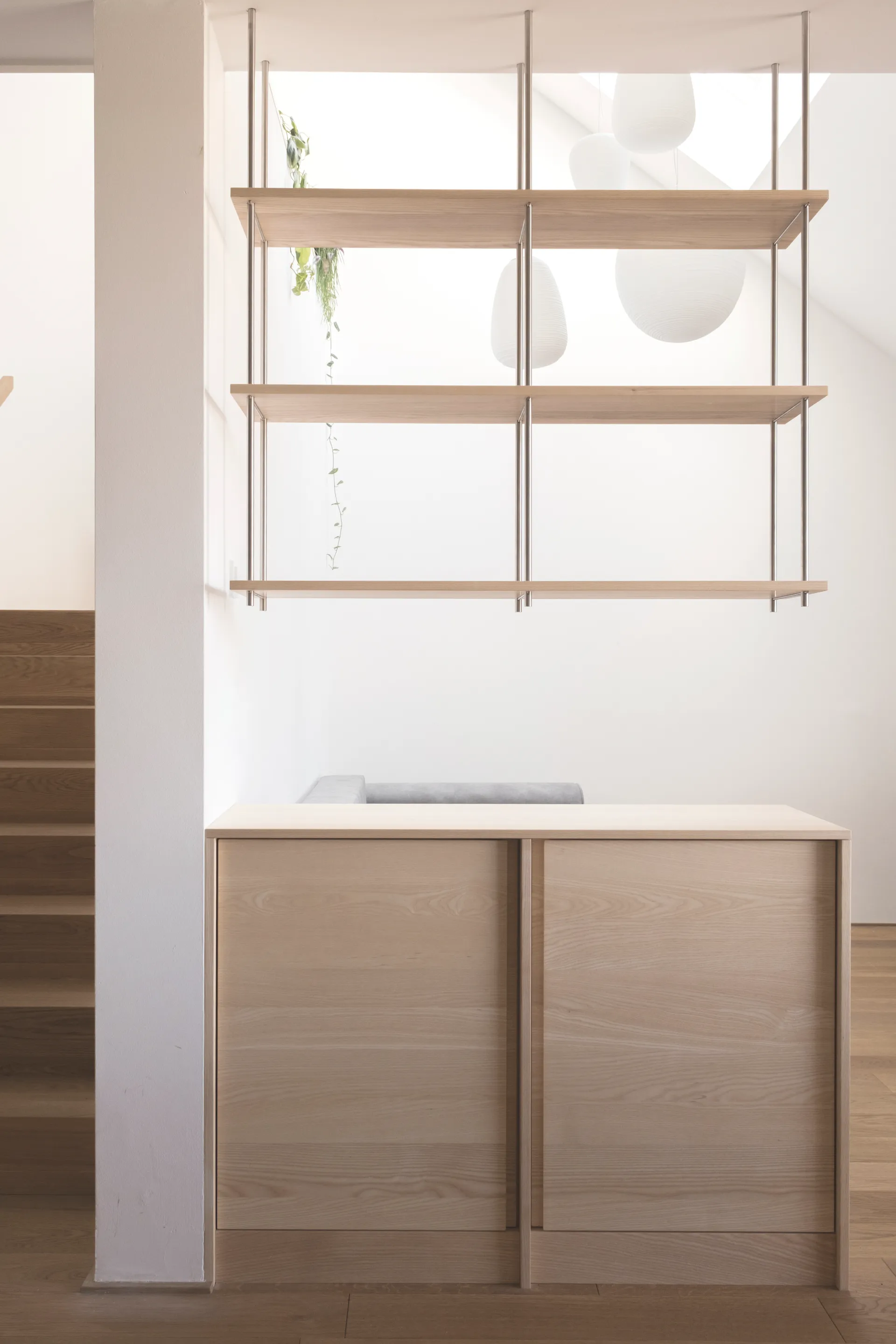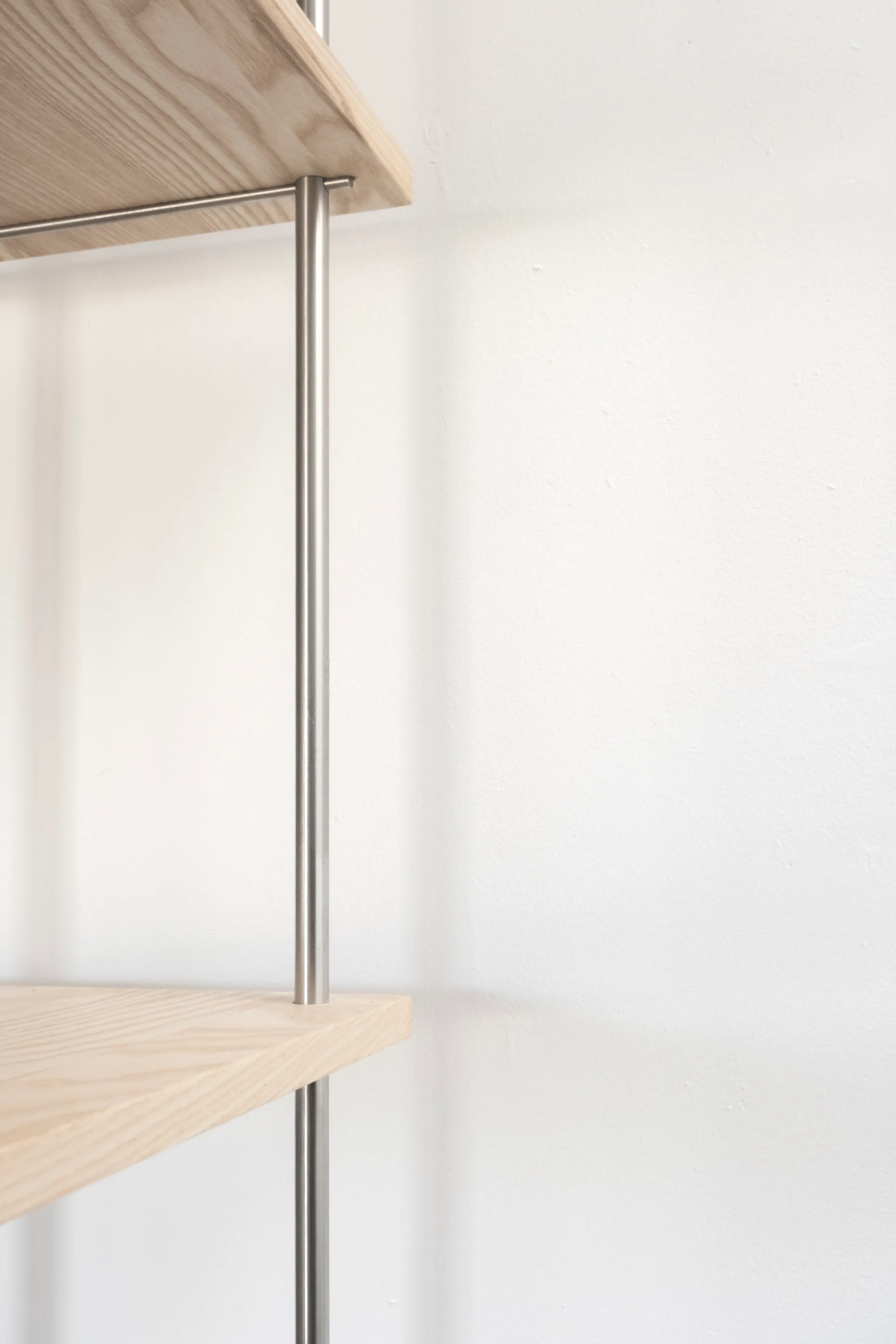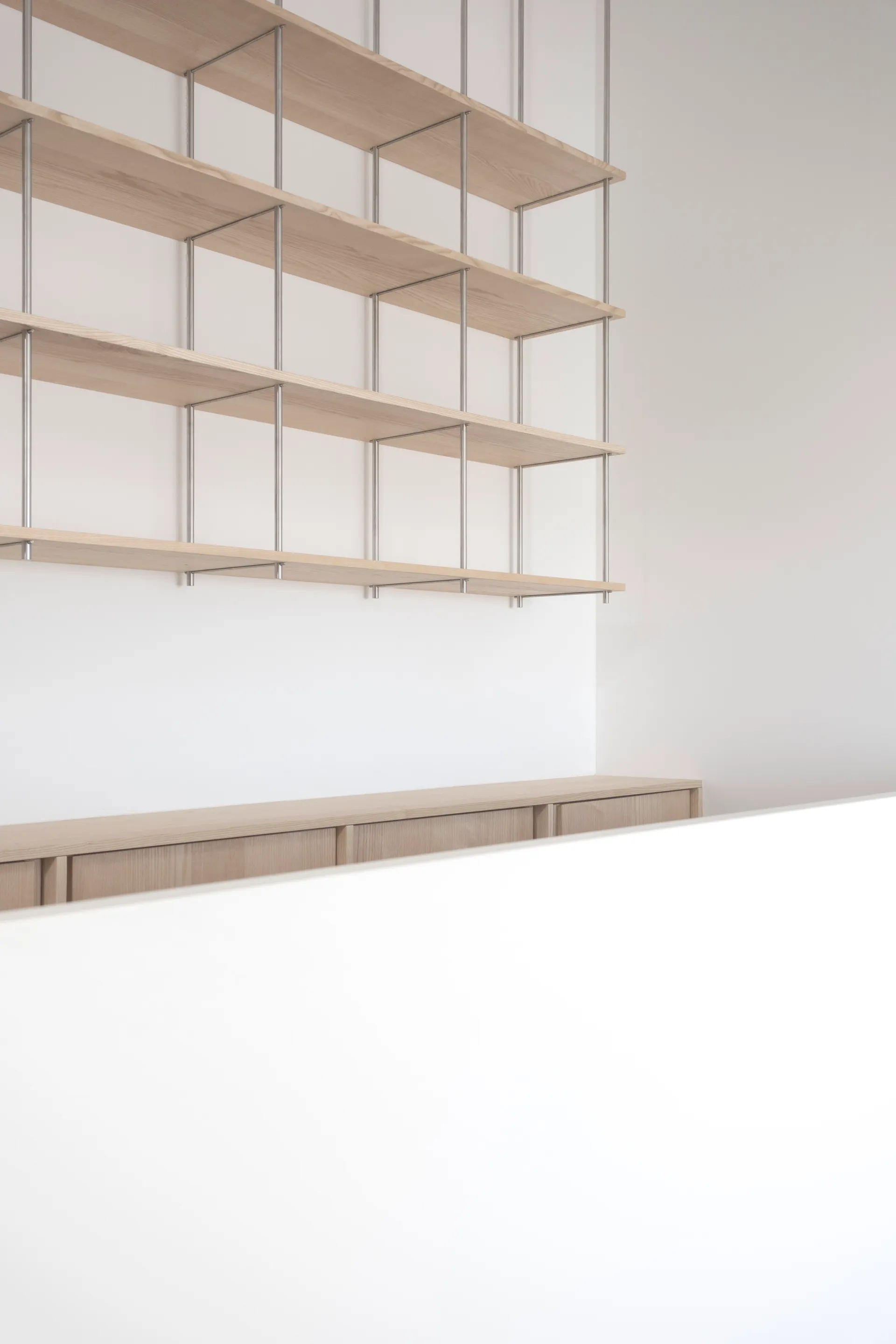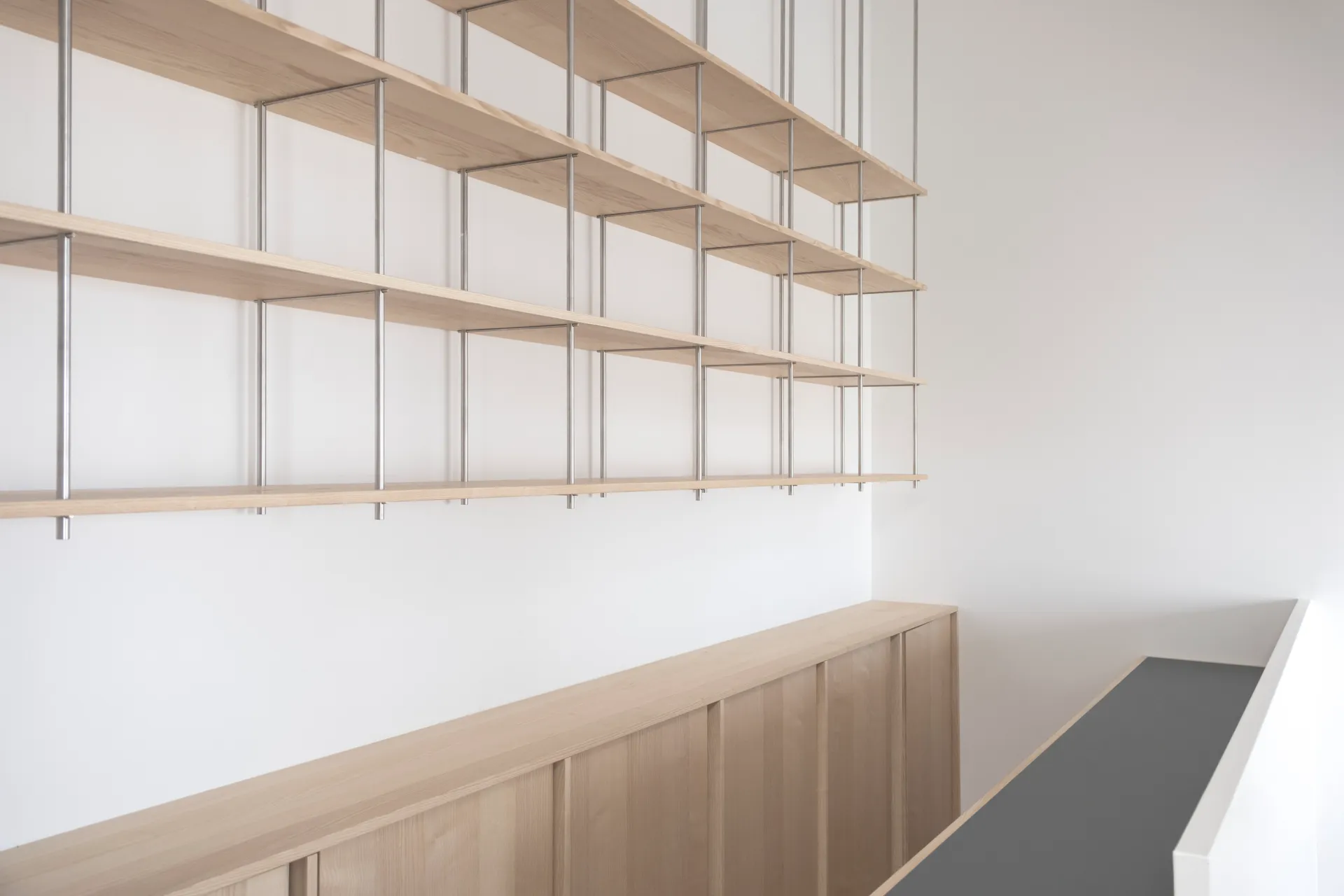 Das Regalsystem, sorgfältig aus Edelstahl und Esche gefügt; erlaubt auf die unterschiedlichen räumlichen Situationen zu reagieren und schafft dabei Kontinuität und Flexibilität.
