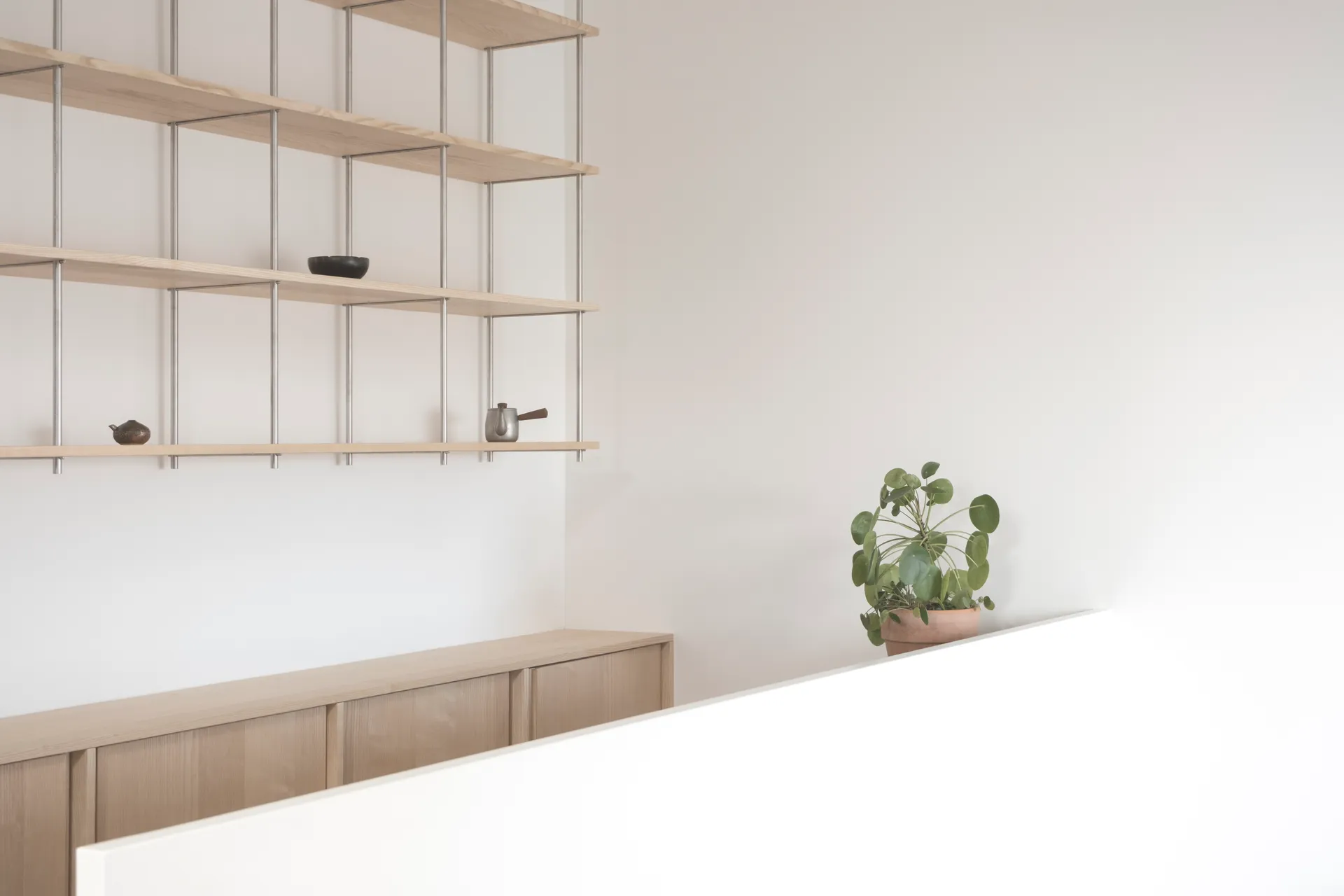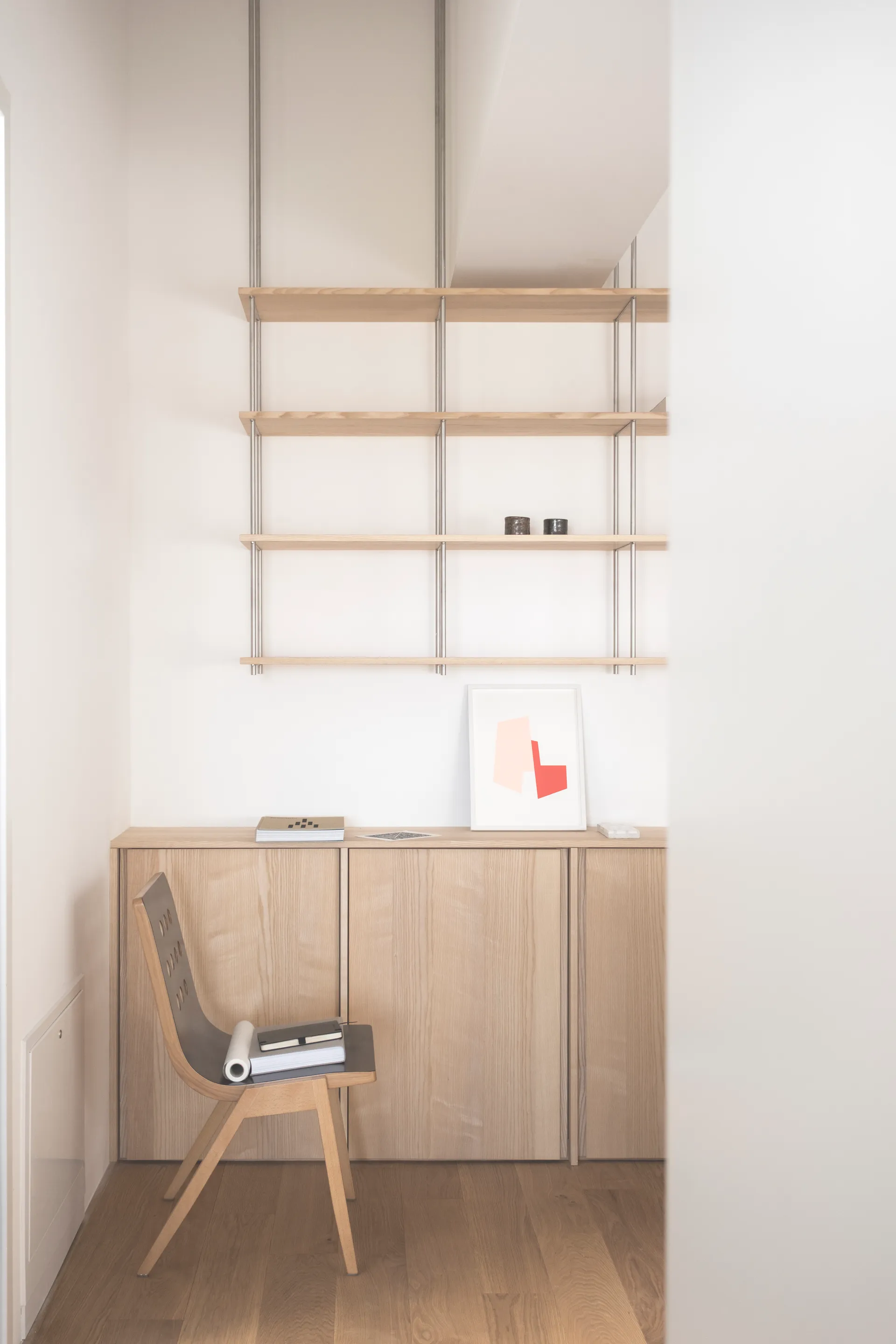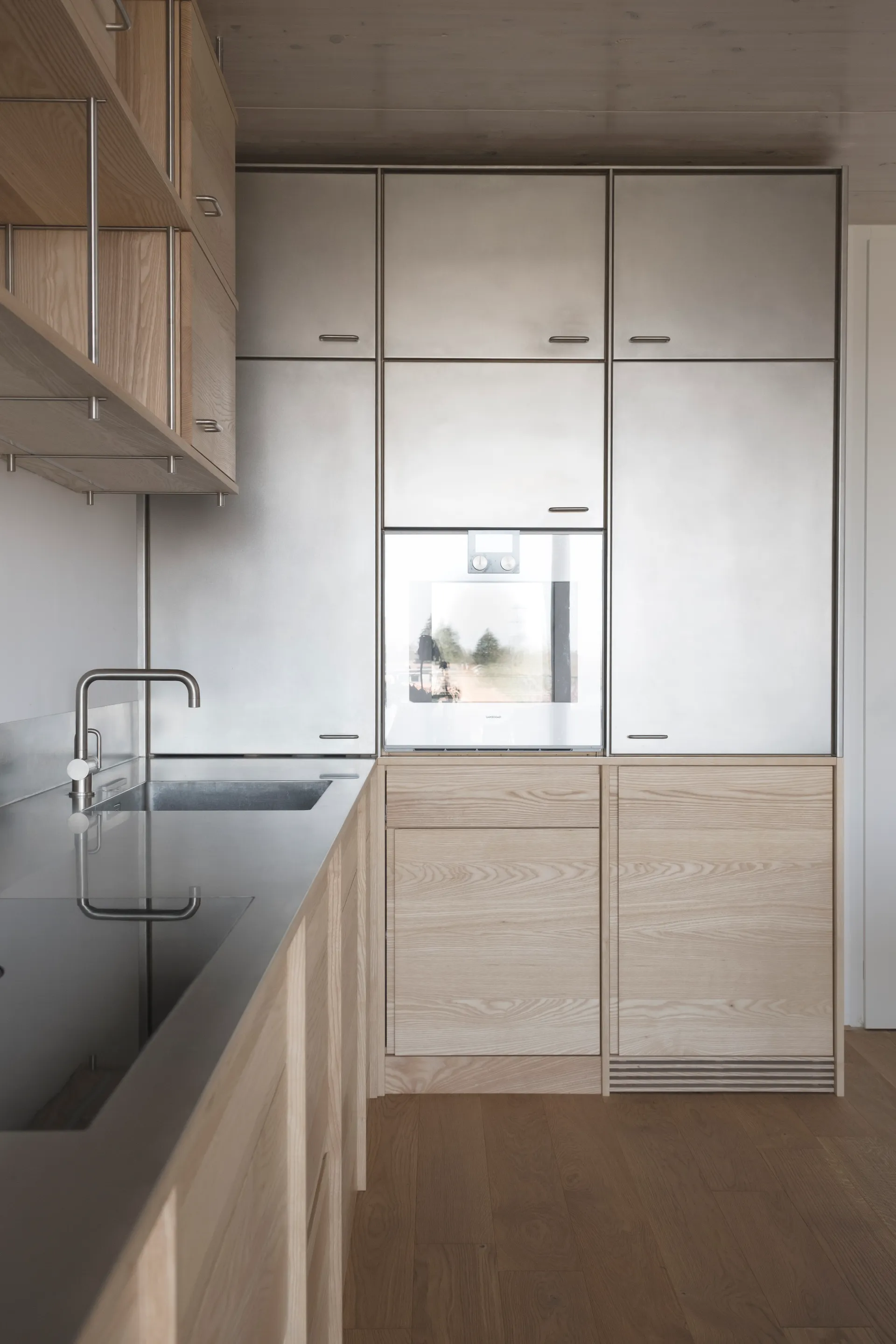 Das Regalsystem, sorgfältig aus Edelstahl und Esche gefügt; erlaubt auf die unterschiedlichen räumlichen Situationen zu reagieren und schafft dabei Kontinuität und Flexibilität.