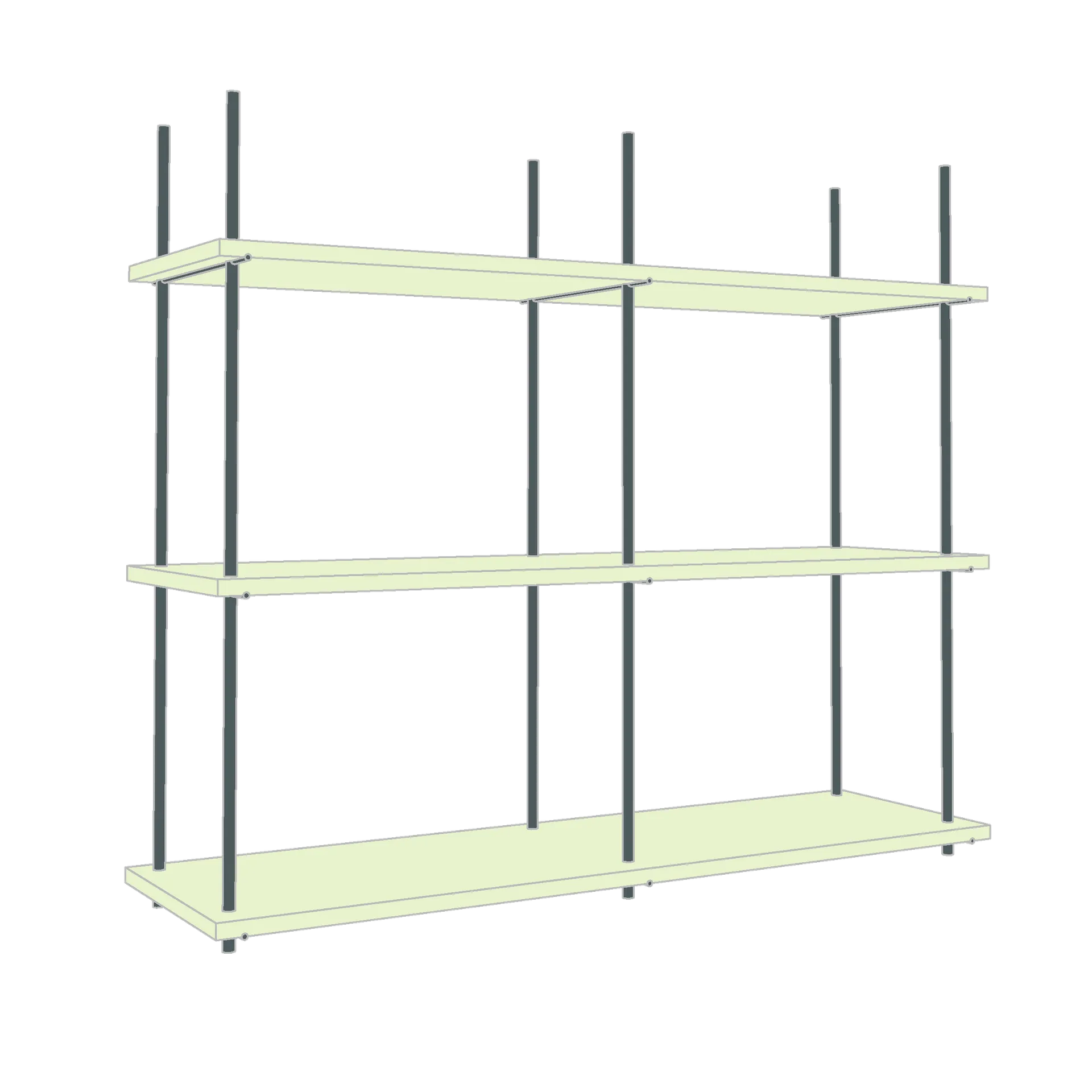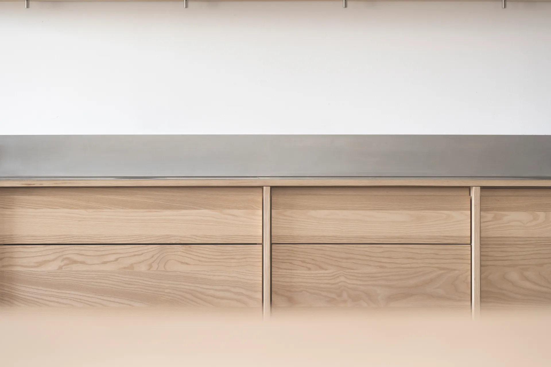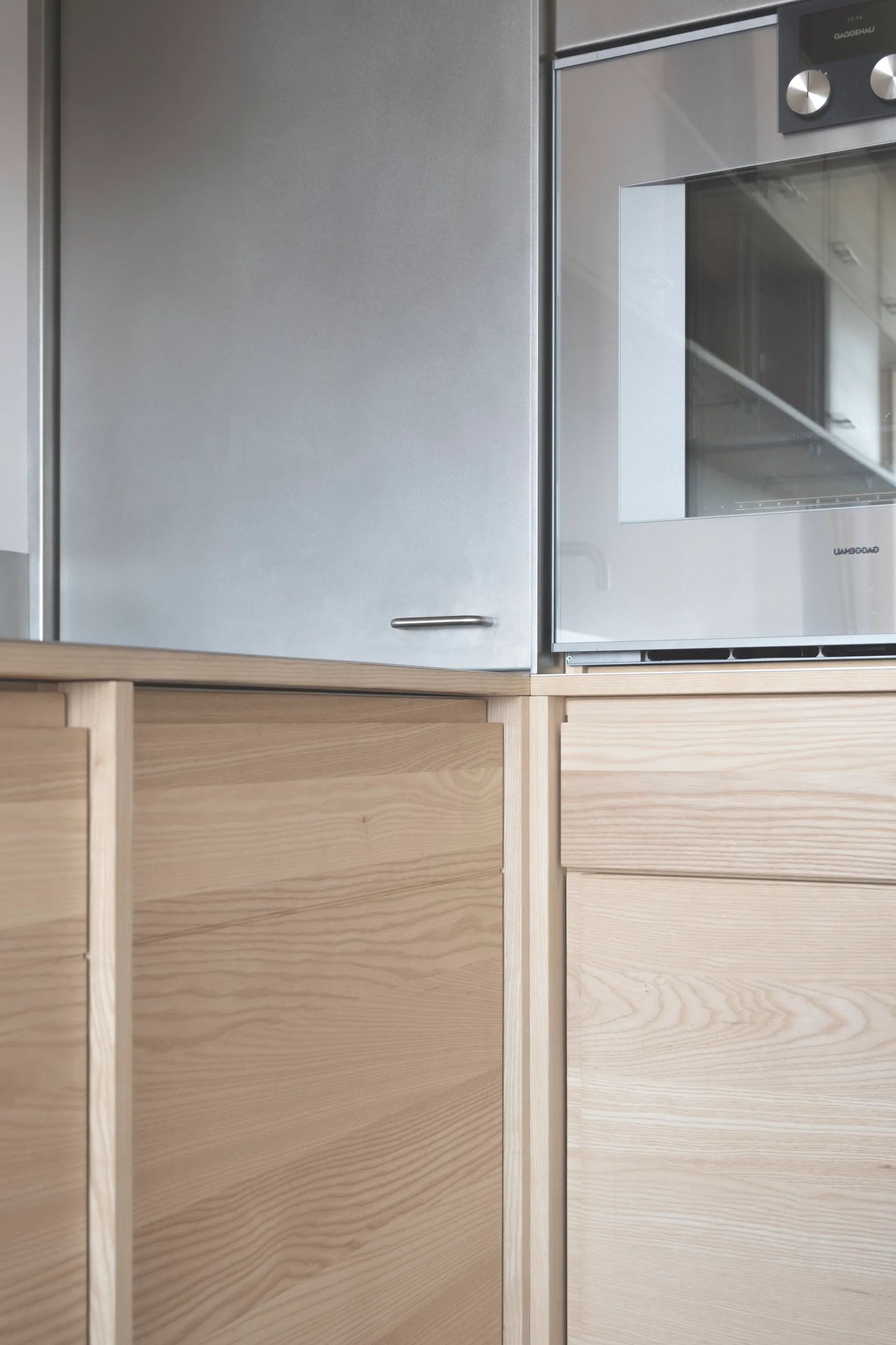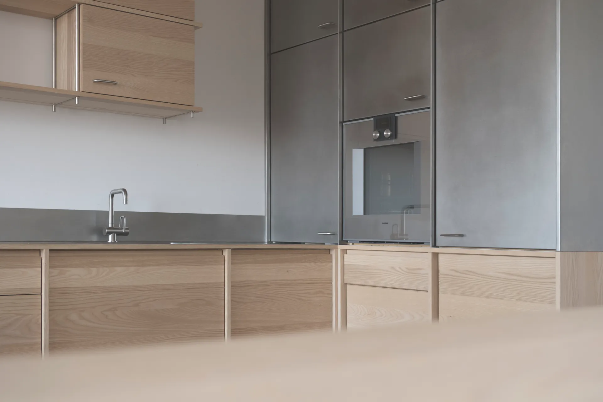 Das Regalsystem, sorgfältig aus Edelstahl und Esche gefügt; erlaubt auf die unterschiedlichen räumlichen Situationen zu reagieren und schafft dabei Kontinuität und Flexibilität.